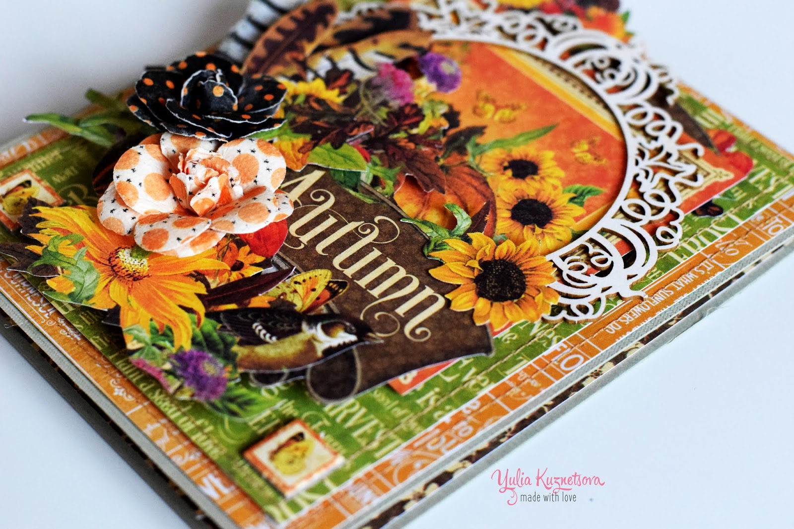 Зашла показать вам простую открытку с поп-ап элементами внутри, сделанную для команды мечты). Открытка была сделана за один вечер. Зато до этого я месяц думала - что же сделать? Заданием было сделать любую работу с поп-ап элементом. Соблазнялась на альбом, но с малышом сейчас мои мозги настолько сильно не варят))). Потому решено было сделать открытку, непременно осеннюю. Осень обожаю, особенно сентябрь. И тут вовремя подоспела дизайнерская посылочка с тыквенным чипбордом. И все сложилось само собой).